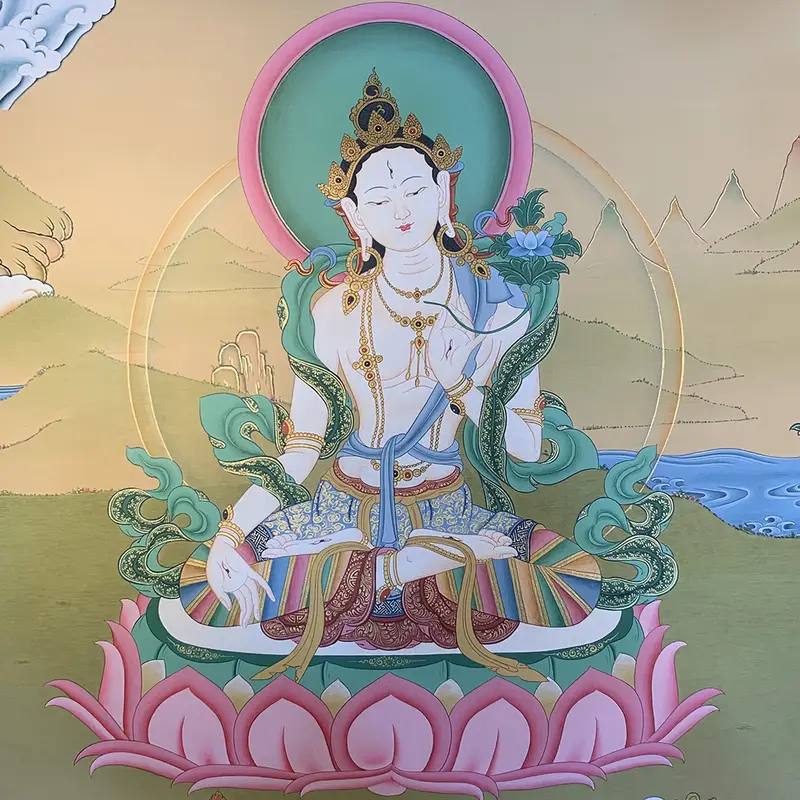 Тара - женское воплощение сострадания всех будд. В образе Белой Тары она олицетворяет мудрость, является одним из божеств, дарующих долголетие и защиту, и помогает приумножать заслуги. Ее благословение помогает преодолевать опасности и страхи, предотвращать преждевременную смерть, а также направлять жизнь на духовный путь и позитивное развитие. Практика Белой Тары также оказывает положительное воздействие на окружающую среду.